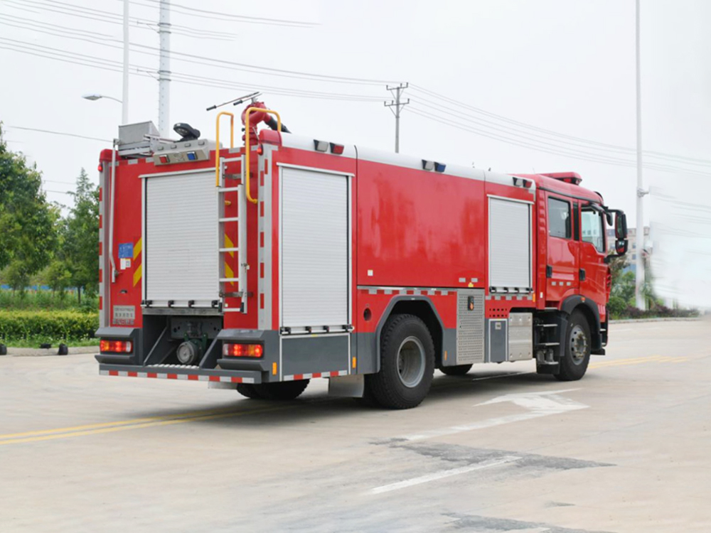 消防泵在箱体中间或者后置,泵房左右两侧4个出水口、器材箱左右后侧均有新款易拉高强度铝合金卷帘门。